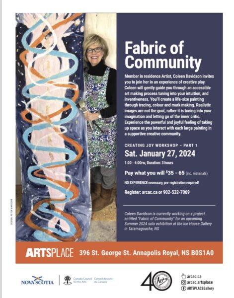 Member in residence Artist, Coleen Davidson invites you to join her in an experience of creative play. Coleen will gently guide you through an accessible art making process tuning into your intuition, and inventiveness. You will create a life-size painting through tracing, colour and mark making. Realistic images are not the goal, rather it is tuning into your imagination and letting go of the inner critic. Experience the powerful and joyful feeling of taking up space as you interact with each large painting in a supportive creative community.All welcome no experience required. Pay what you will $35-65 (including materials)
